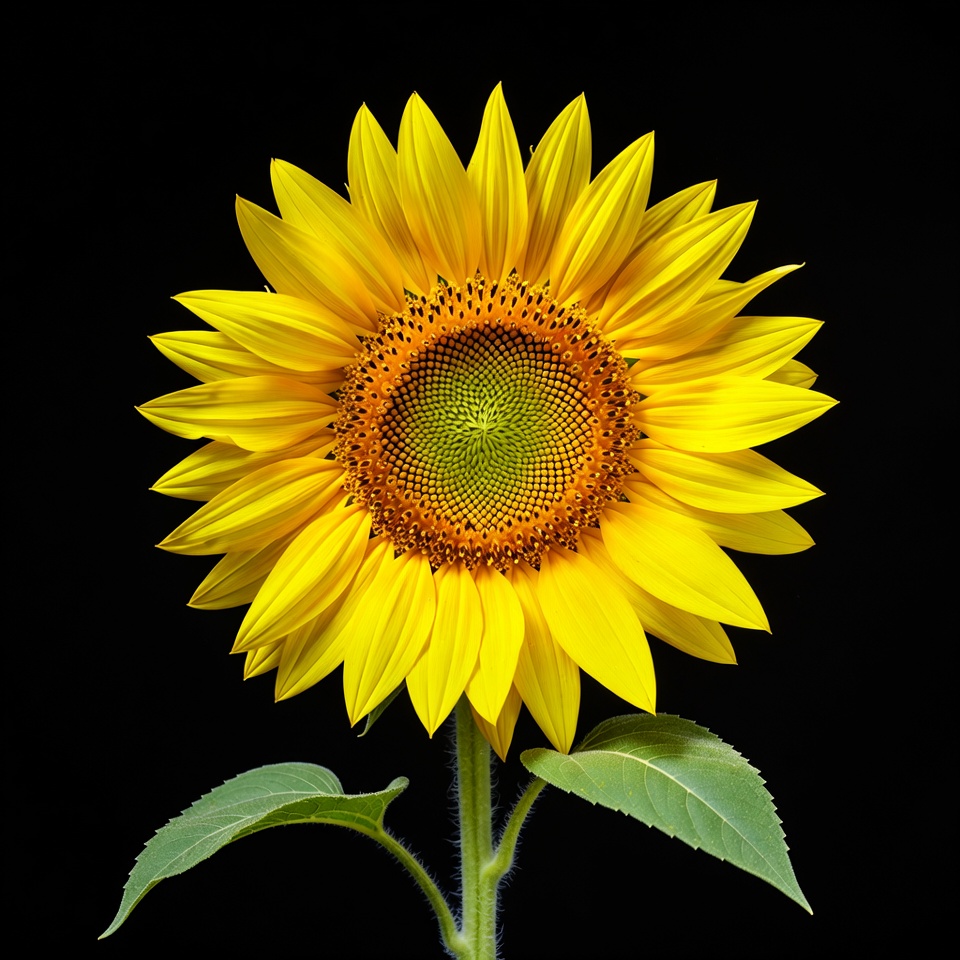 Helianthus, black background, bloom, botany, floral, flower center, flower petals, green leaves, green stem, isolated, large flower, nature, vibrant, yellow flower, sunflower