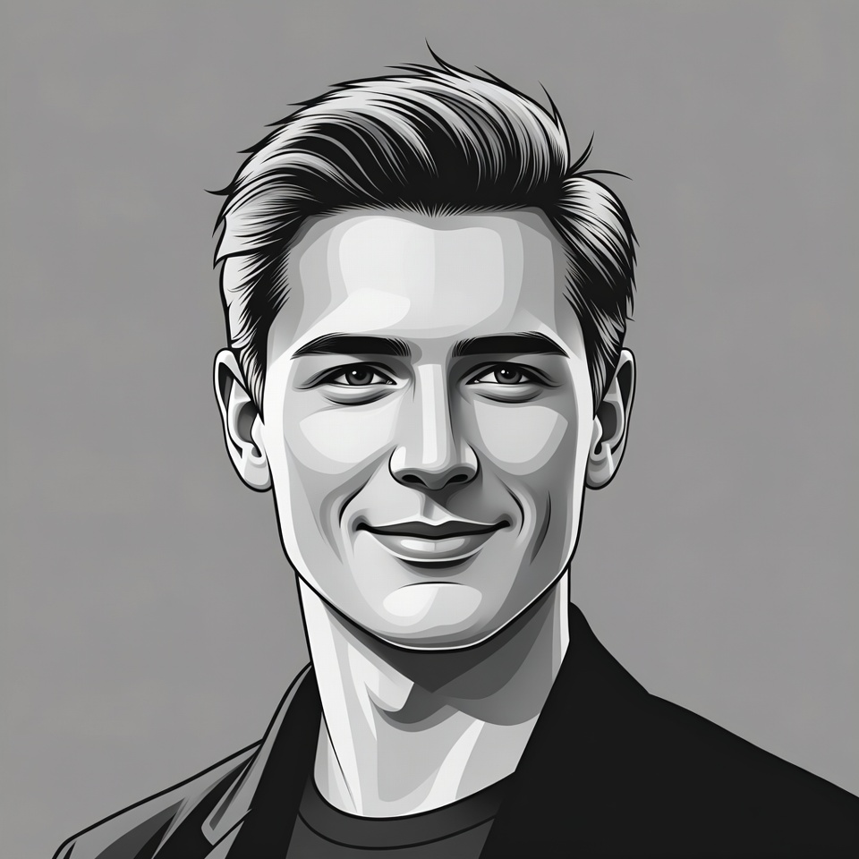 A digital grayscale illustration of a young man with neatly combed hair smiles at the viewer. He wears a dark jacket over a t-shirt and is depicted against a plain gray background. The portrait features clean line art with subtle shading on his face and clothing.