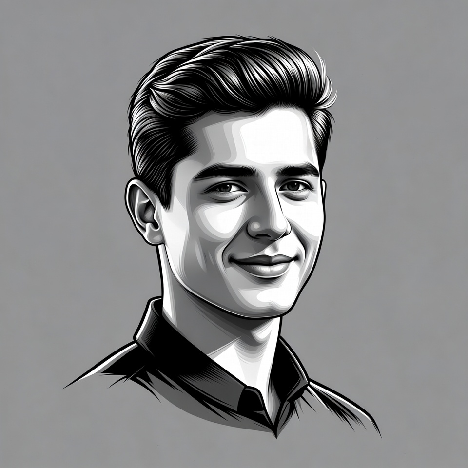 A digital grayscale illustration of a young man with neatly combed black hair and a gentle smile. He wears a collared shirt and faces slightly to the side against a plain gray background. The portrait features smooth shading and detailed facial features.