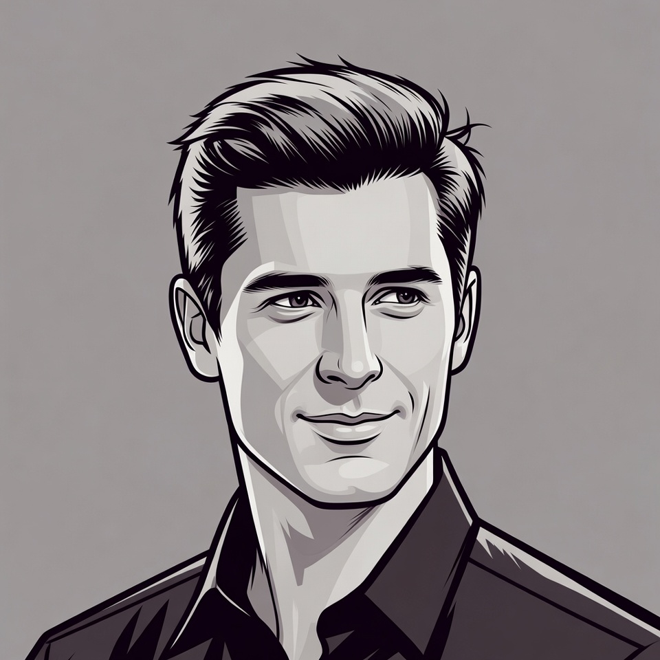 A vector illustration of a handsome man with neatly combed hair smiles confidently at the viewer. He wears a dark collared shirt and is depicted in a clean line art style against a plain gray background. The portrait highlights his sharp facial features and subtle expression.