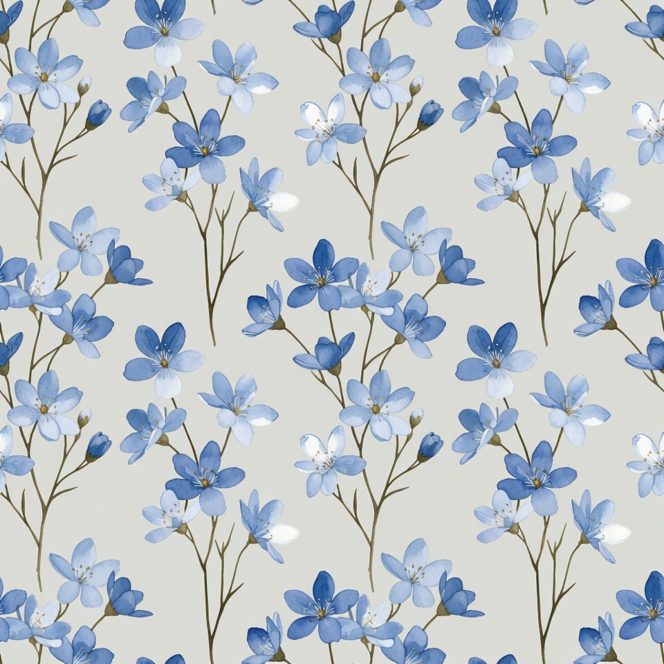 clipart, delicate flowers, five petals, floral design, floral pattern, flower stems, flowers, illustration, isolated background, light gray background, pattern background, repeating pattern, seamless pattern, watercolor flowers, white centers, blue flowers
