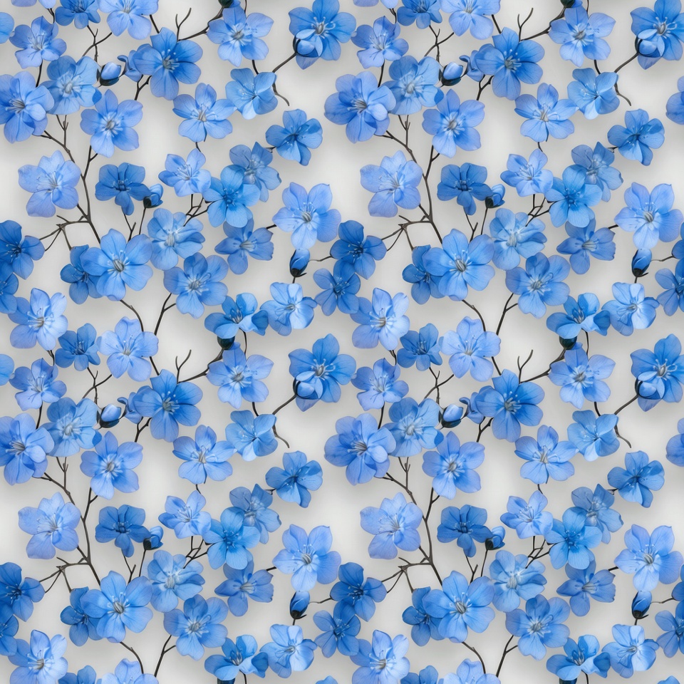 A seamless pattern features numerous small blue forget-me-not flowers with yellow centers and thin green stems. The flowers are densely arranged against a light gray background. The design repeats continuously for use as wallpaper or fabric.