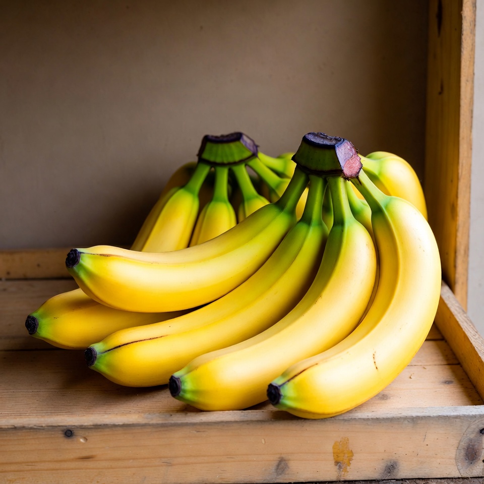 A large bunch of ripe yellow bananas with dark tips rests on a wooden shelf. The bananas are clustered together with green stems and vibrant yellow peels. They are placed against a neutral beige background.