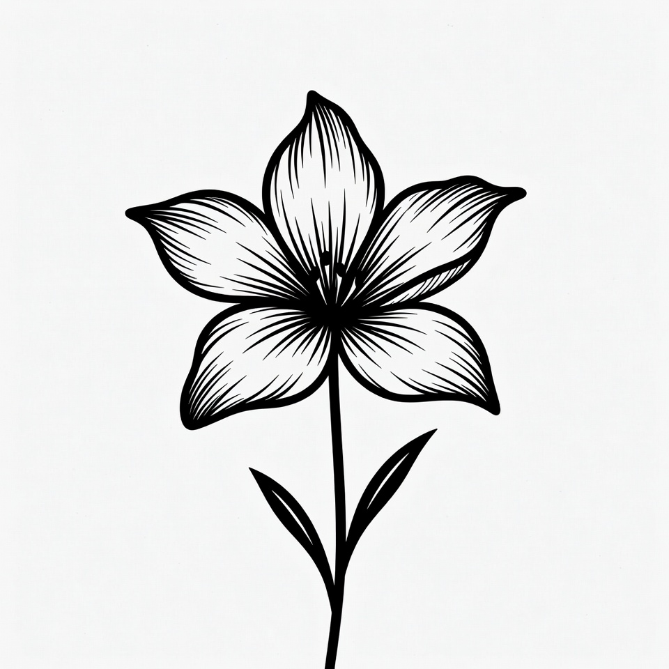 black and white, botanical art, clipart, floral drawing, flower outline, illustration, ink drawing, isolated background, leaves, line art, petal, stamen, stem, vector flower, lily flower