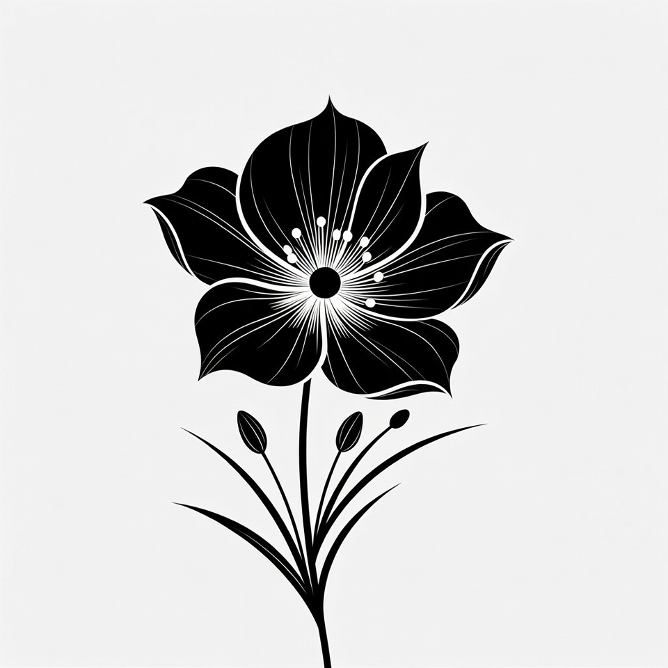 A detailed black silhouette of a flower with multiple curved petals and a bright white center is depicted against a plain white background. The flower has a slender stem and two small buds extending from it. The illustration features smooth, elegant line art.