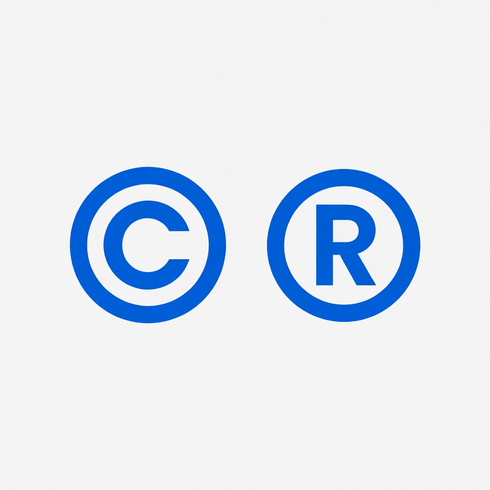 Two blue circular symbols are displayed side by side on a white background. The left symbol features a white 'C' inside a blue circle, representing copyright. The right symbol shows a white 'R' inside a blue circle, indicating registered trademark.