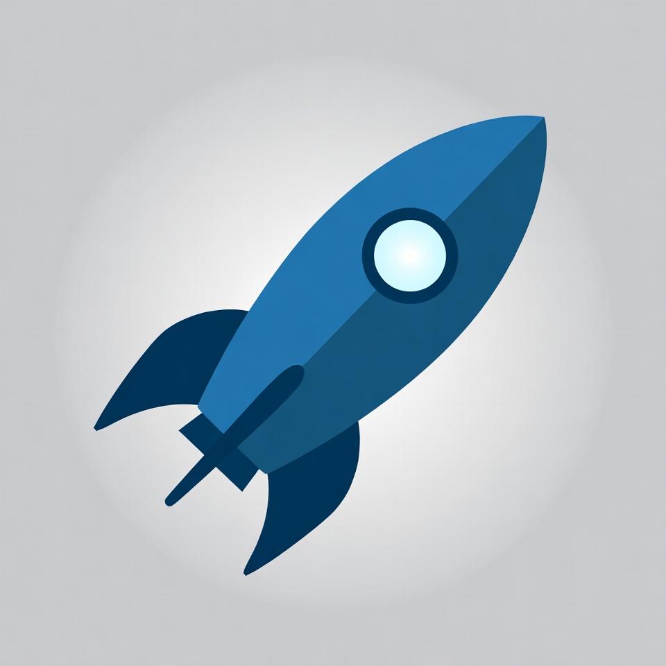 A simple blue rocket illustration with a white circular window and pointed nose. It features black fins at the base and trails flames from the engines. The design is flat and vector-style on a light gray background.