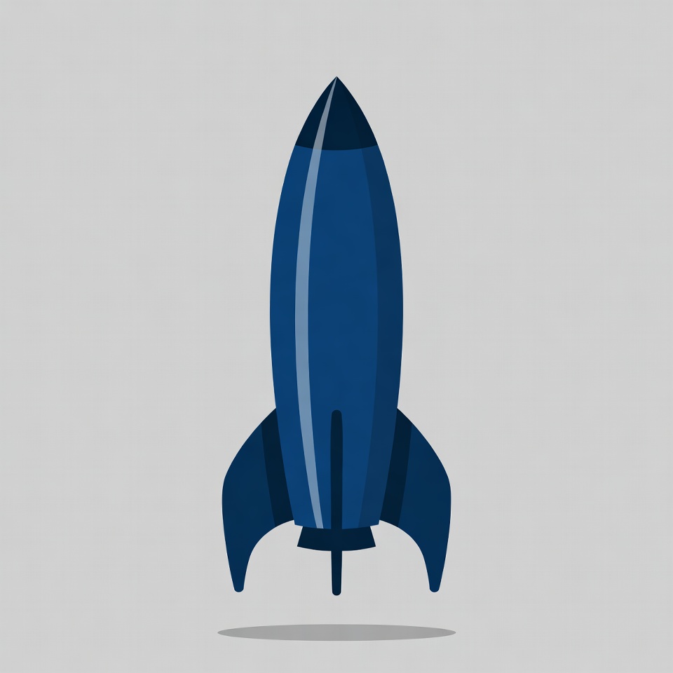 A simple blue rocket ship illustration stands upright on a light gray background. It features a pointed nose cone, a body with a small window, and flared fins at the base. A subtle shadow appears beneath it.