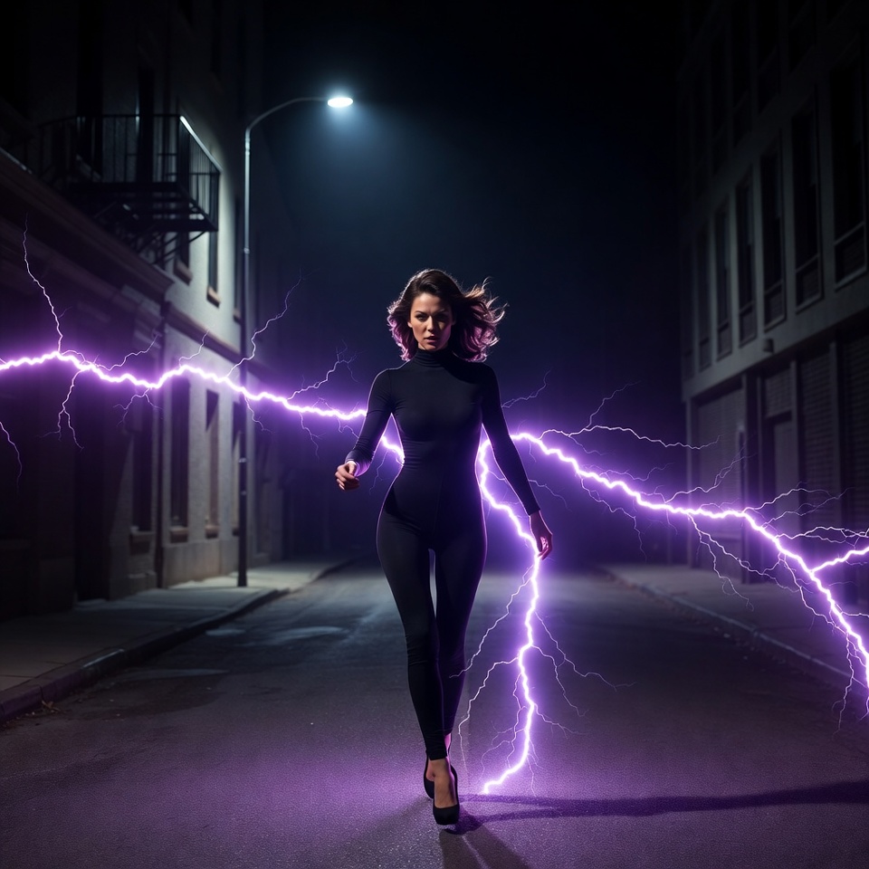 White, black bodysuit, brick buildings, brown hair, dark alley, electricity, female, high heels, lightning, night, purple lightning, running, streetlights, thunderbolts, urban street, wet pavement, woman