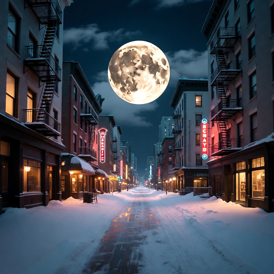 Full Moon Over Snowy Urban Street