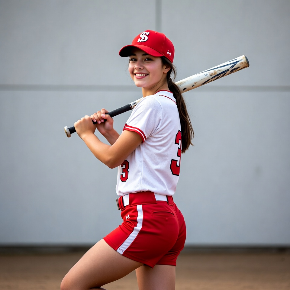 White, athlete, baseball bat, bat over shoulder, batting stance, dirt field, female, jersey, number 3, ponytail, red cap, red shorts, smiling, softball, softball player, sports, uniform, white wall, young girl, girl
