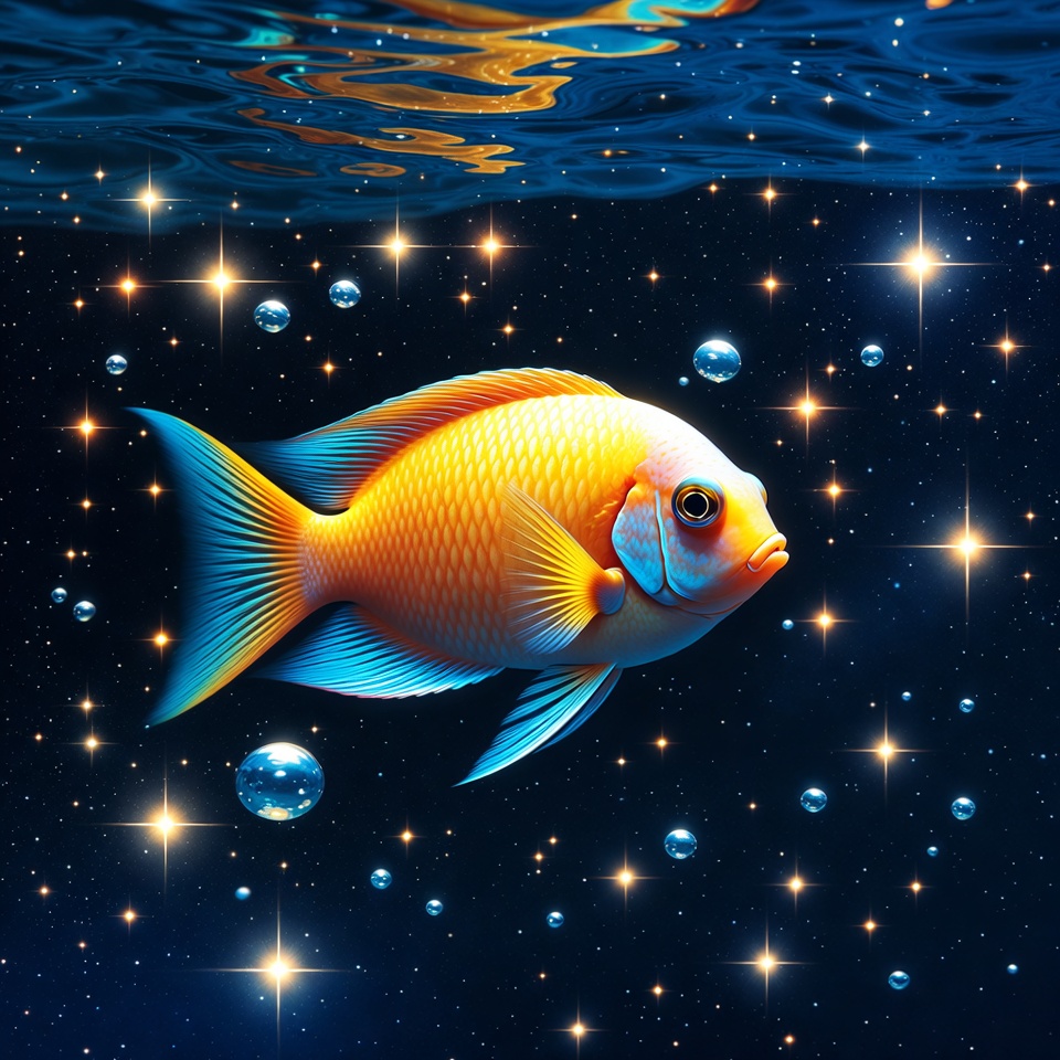 A vibrant golden angelfish swims in a deep blue underwater scene with sparkling stars and bubbles. The fish features orange and yellow hues with blue accents on its fins and face. Reflections and glowing lights enhance the magical aquatic environment.
