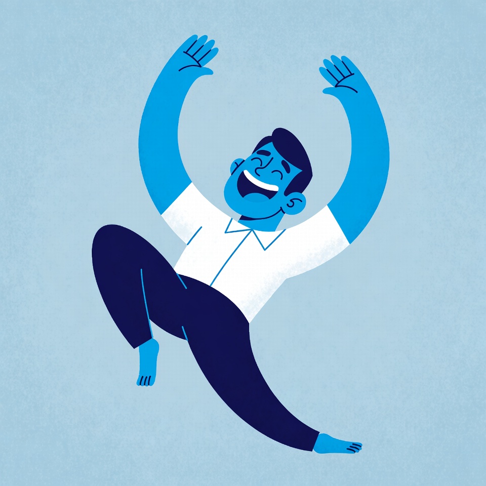 A blue cartoon illustration of a smiling man jumping with arms raised high. He wears a white collared shirt, dark pants, and is barefoot. The figure is set against a solid light blue background.