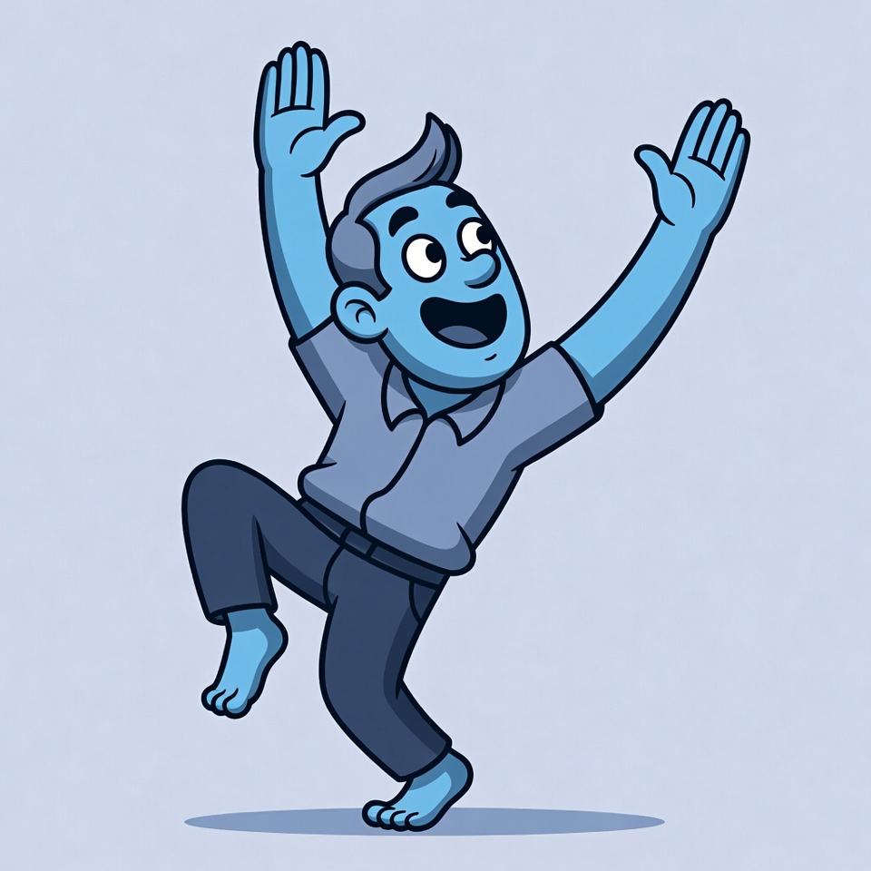 A blue cartoon man with short dark hair raises both arms high in excitement on a light gray background. He wears a short-sleeved light blue shirt and dark pants, with bare feet. His face shows wide eyes and an open smiling mouth.