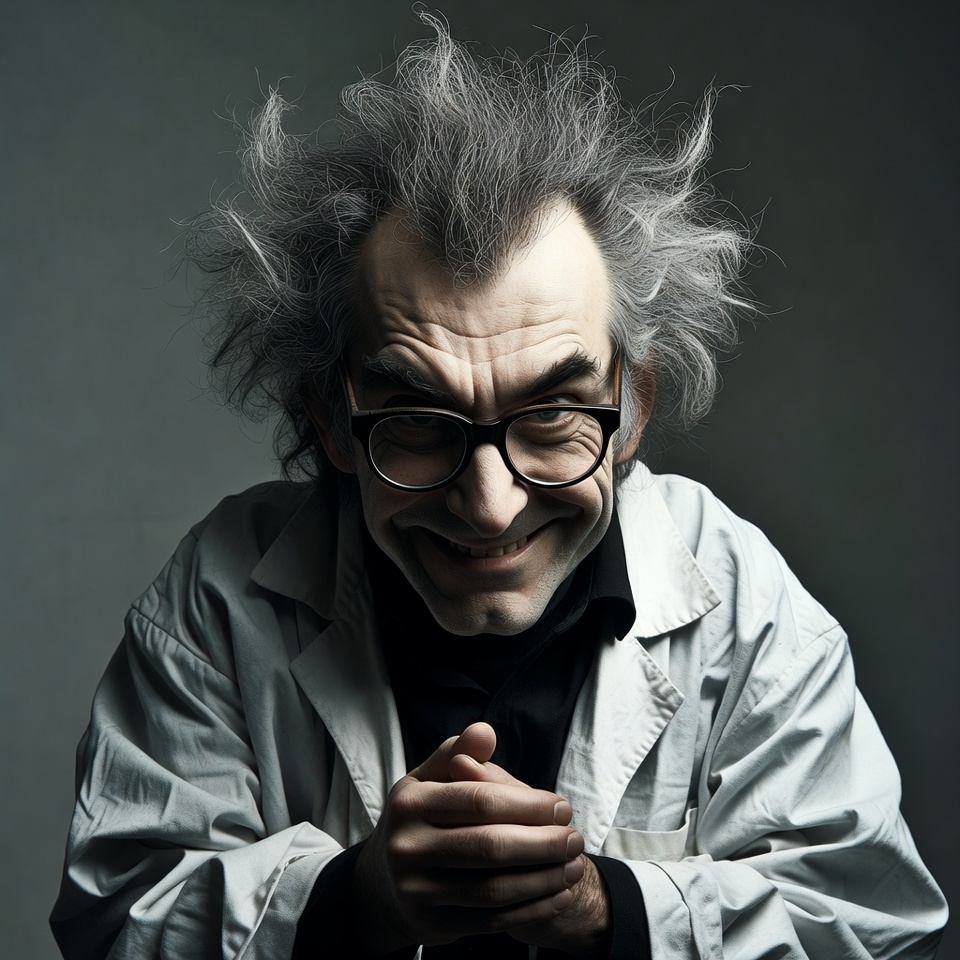 A man with wild gray hair and thick glasses wears a white lab coat and grins mischievously. His face is exaggerated with squinted eyes and a wide smile. He clasps his hands together against a dark background.