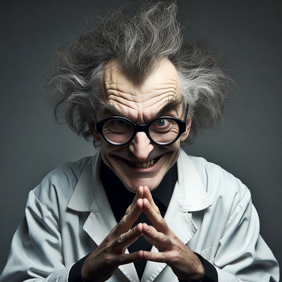 crazy scientist, exaggerated expression, funny face, glasses, gray hair, grinning, hands clasped, illustration, isolated background, lab coat, mad scientist, male, man, portrait, white, white coat, wild hair, scientist
