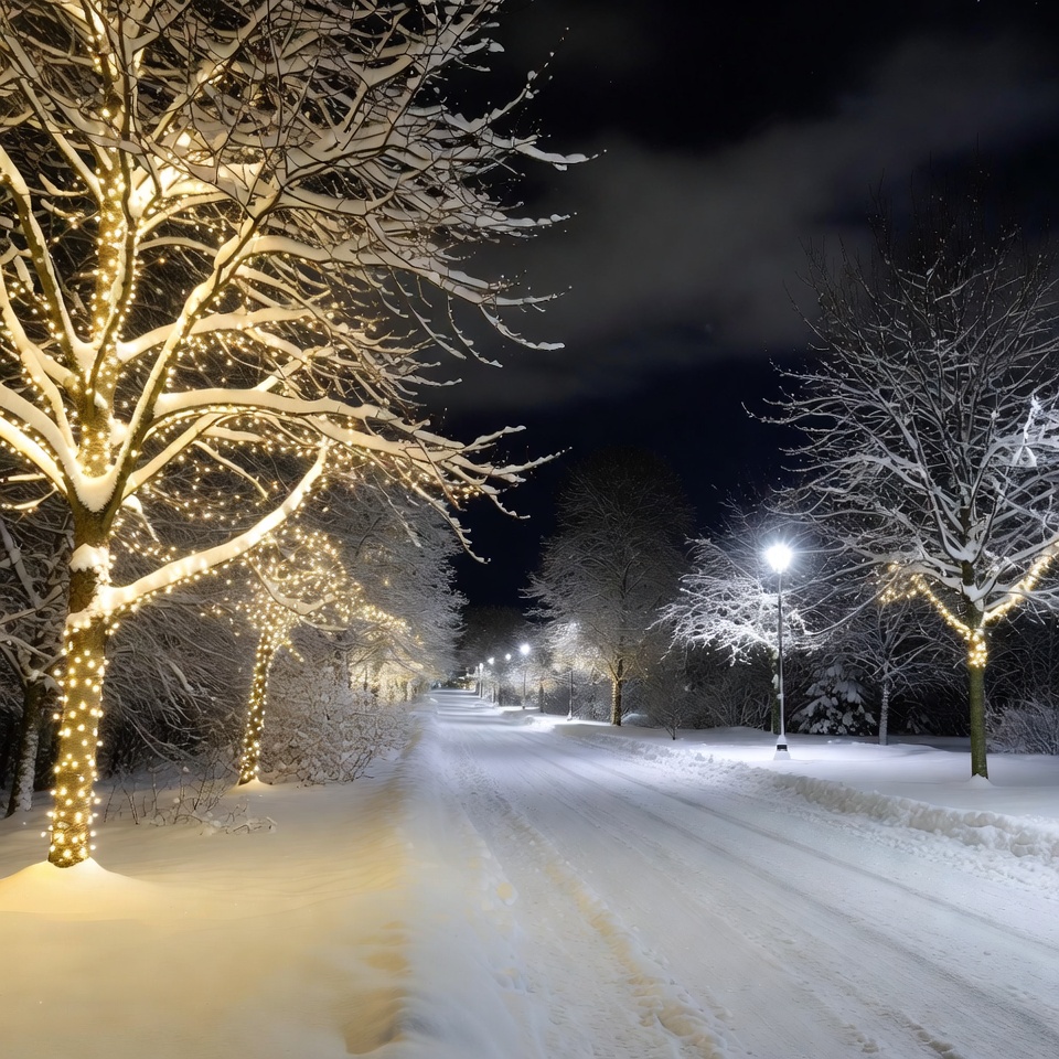 A snowy path winds through a park at night, lined with bare trees decorated with golden Christmas lights. Street lamps illuminate the snow-covered ground and branches. The scene features a dark sky with clouds and distant lit trees.