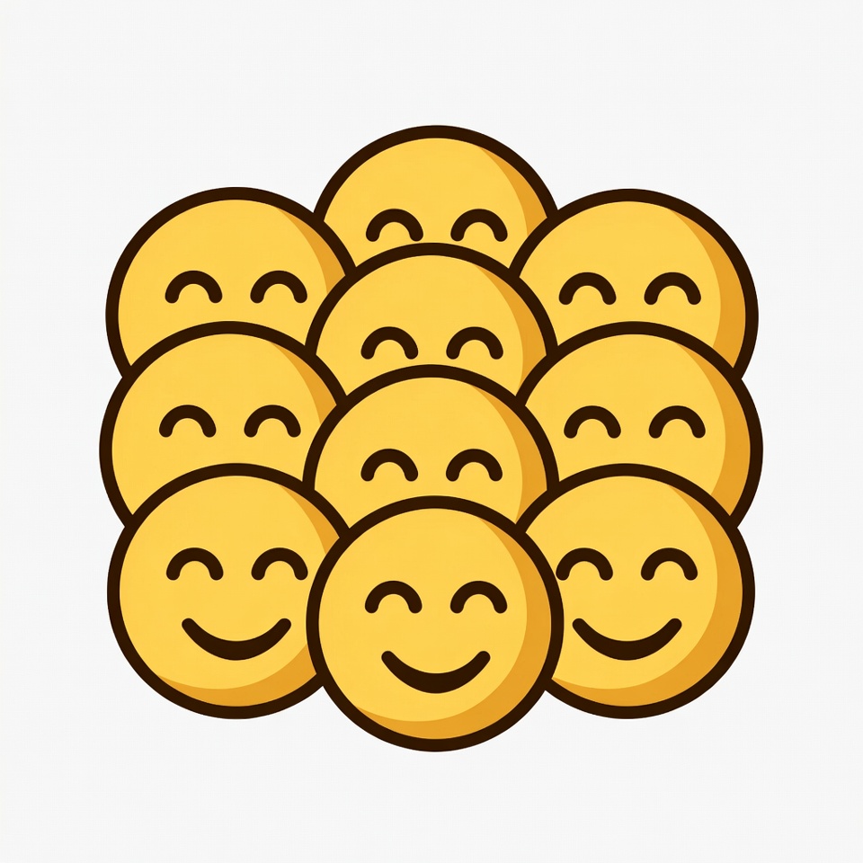 A clipart illustration features a stack of twelve yellow emoji faces with smiling mouths and closed happy eyes. The emojis are arranged in a tight pile on a white isolated background. Each face has a simple black outline and vibrant yellow color.