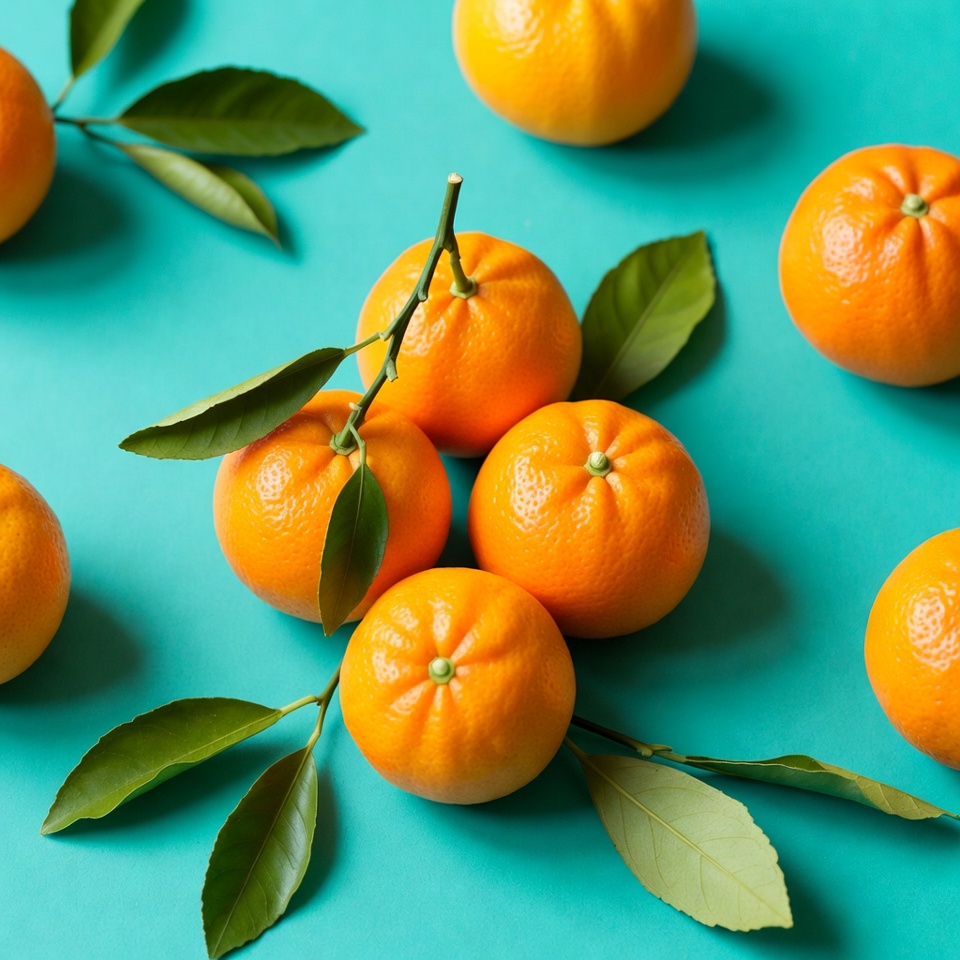 Mandarins with Leaves on Blue Background