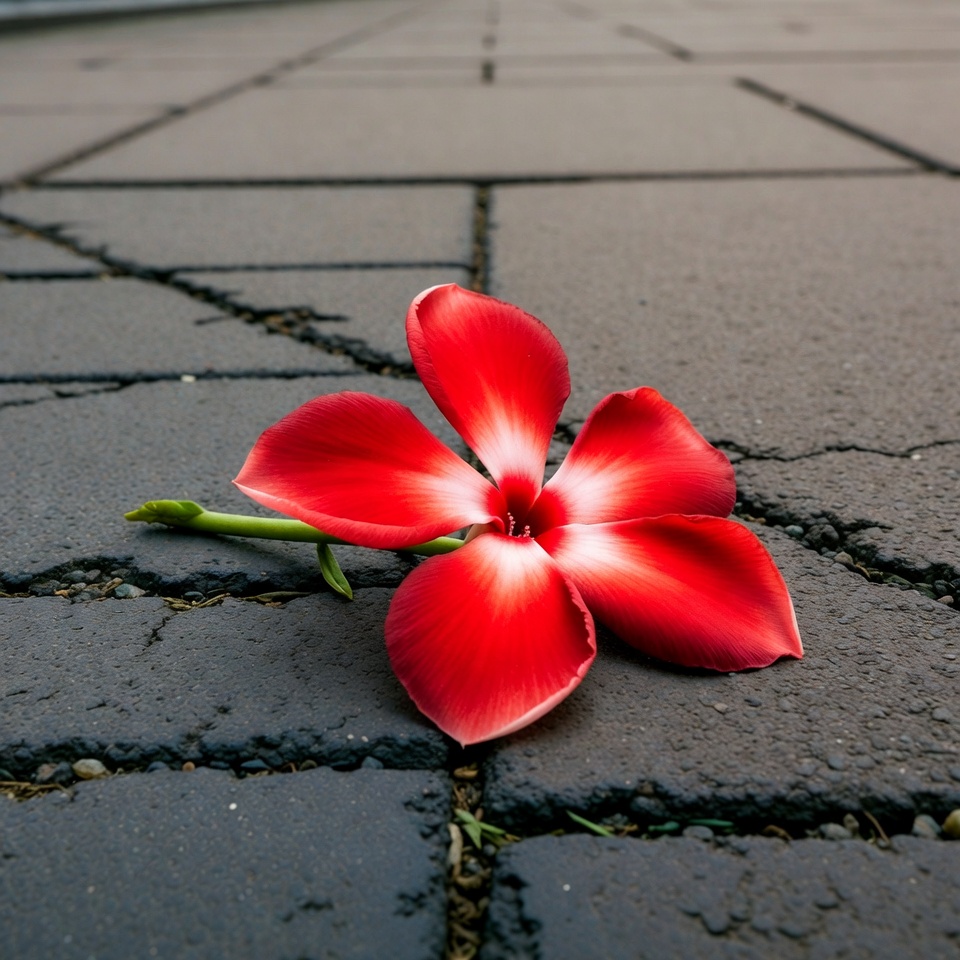 blooming flower, closeup, concrete tiles, cracks, fallen flower, flower petals, frangipani, gray tiles, isolated background, macro, nature, pavement, plumeria, stem, tropical flower, white center, red flower