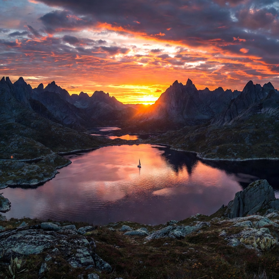Lofoten, Norway mountains, alpine lake, clouds, dramatic sky, golden hour, jagged peaks, lake, landscape, mountain range, mountains, nature, orange sky, outdoor, peaceful water, red sunset, reflection, rocky shore, sailboat sailing, scenery, serene lake, sunset, valley, vibrant colors, water, wilderness, sailboat