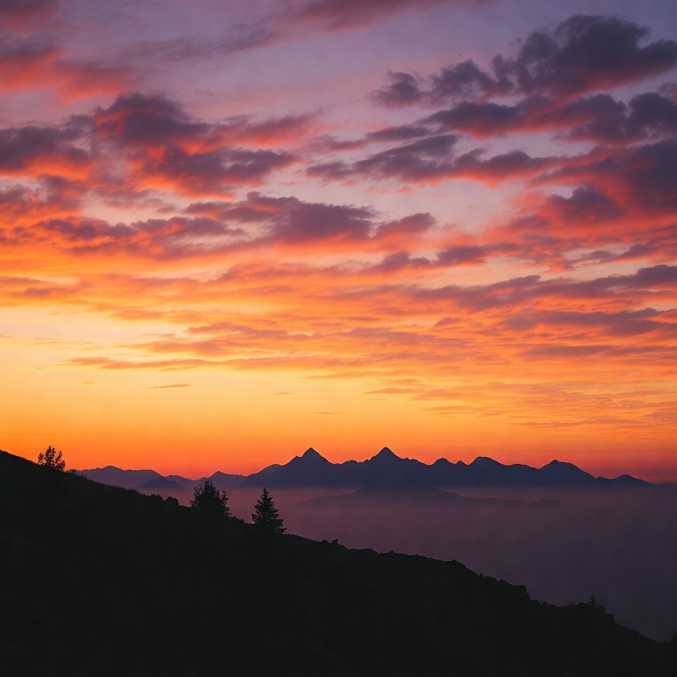 alpine scenery, clouds, dramatic sunset, forest silhouette, horizon, jagged mountains, layered clouds, mist, mountain ridge, mountains, nature landscape, orange sky, pine trees, pink clouds, purple hues, silhouette trees, sky, snowy peaks, valley mist, sunset