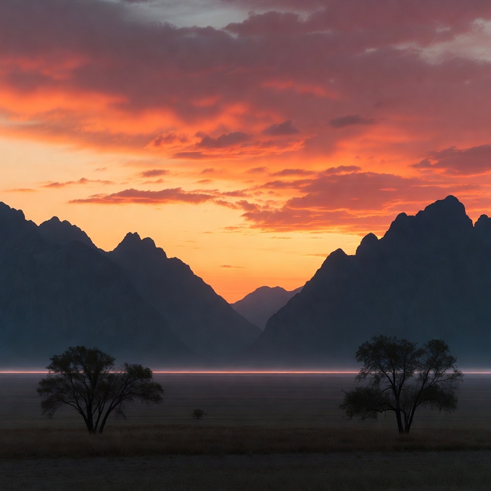 A vibrant sunset with orange, pink, and purple clouds illuminates jagged mountain peaks framing a wide valley. Sparse trees stand in the foreground on a flat grassy plain bathed in warm light. The sky transitions from deep blue at the top to glowing hues near the horizon.
