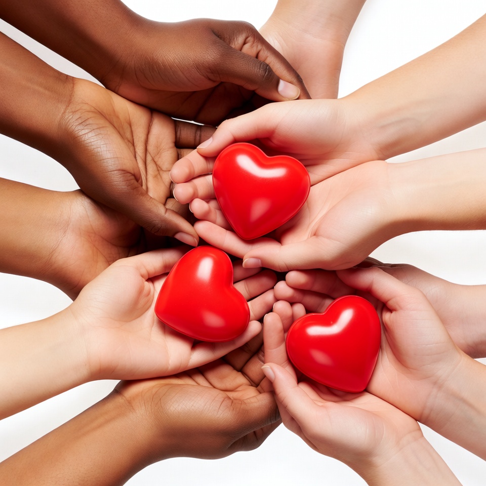 Multiple hands of various skin tones and sizes form a circle, collectively holding several shiny red hearts in the center. The hands include both adult and child sizes, arranged symmetrically on a plain white background. The composition emphasizes unity through diversity in holding the hearts.