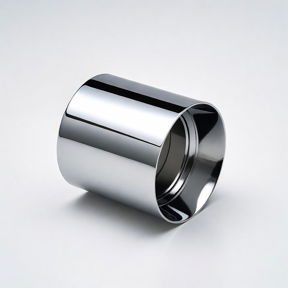 A highly polished chrome cylindrical component with a metallic sheen is shown against a white background. It features a smooth exterior surface and an open interior with subtle threading visible inside. The object is isolated and centered in the frame.