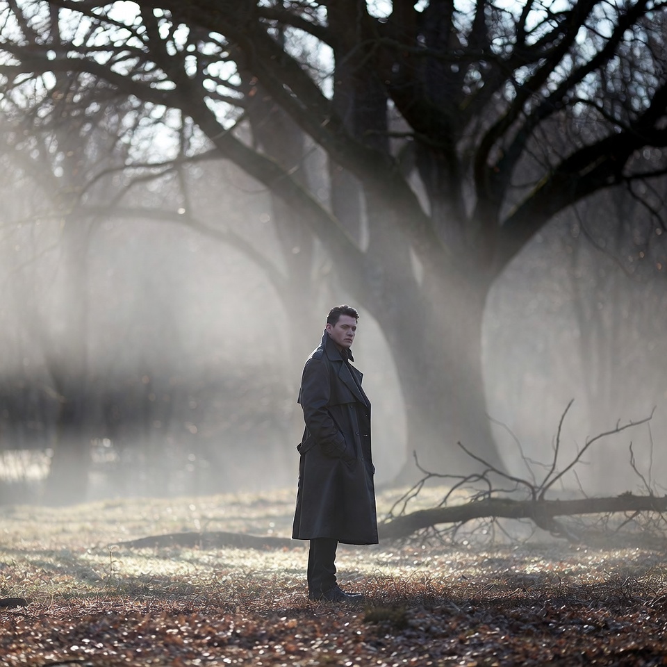 A man stands alone in a misty autumn forest surrounded by tall bare trees. He wears a long dark trench coat and black pants, with sunlight filtering through the fog and branches. Fallen leaves cover the ground beneath him.