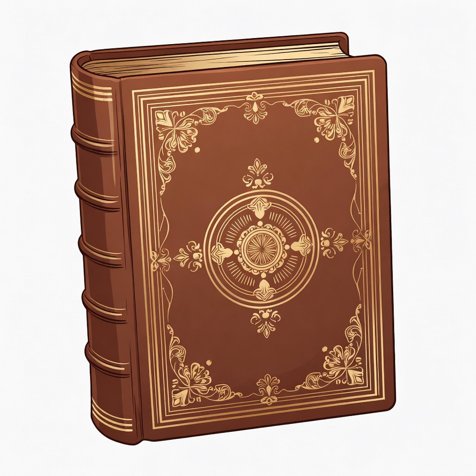 antique book, book cover, book illustration, brown book, circular design, clipart, detailed illustration, fantasy book, filigree, floral motifs, gold accents, gold trim, isolated background, leather book, magic book, ornate design, vector art, vintage book, open book