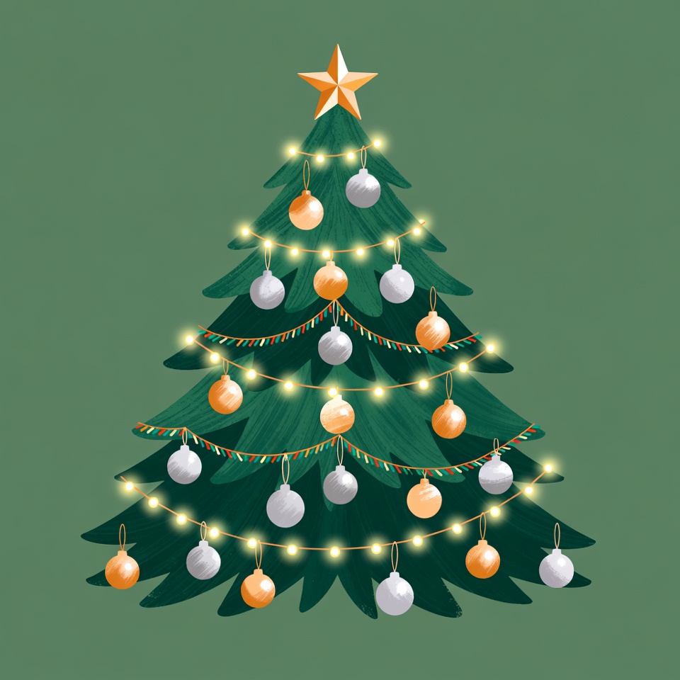 A vibrant green Christmas tree stands on a solid green background, adorned with gold and silver ornaments. Twinkling string lights wrap around its branches, and a shining gold star tops the tree. The illustration features a festive design with glowing effects on the decorations.