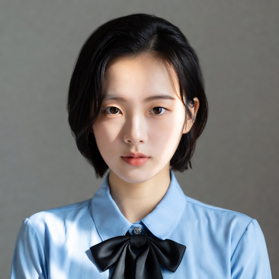 Asian, black bowtie, black hair, blue shirt, bob haircut, collared shirt, female, gray background, headshot, light blue clothing, neutral expression, portrait, straight hair, young woman, woman