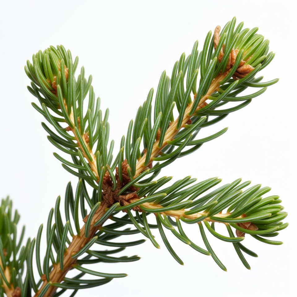 Christmas fir, botany, close-up, conifer, evergreen branch, fir tree, forest plant, fresh needles, green needles, holiday branch, nature, needles, pine needles, plant, reddish tips, spruce branch, tree branch, white background, woody stem, fir branch
