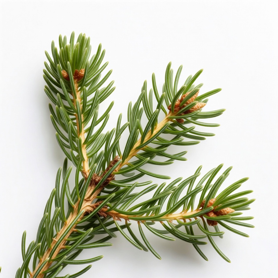A close-up of a fresh green fir tree branch featuring soft needles and small brown buds. The branch is positioned diagonally against a plain white background. The needles are vibrant green with fine, feathery texture.