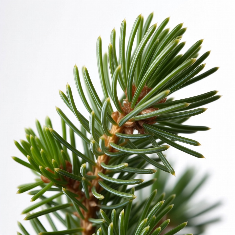 A close-up view of a fresh green fir tree branch with long, soft needles. The needles are arranged radially around the branch, with new growth tips showing lighter green and brown hues. The branch is isolated against a plain white background.