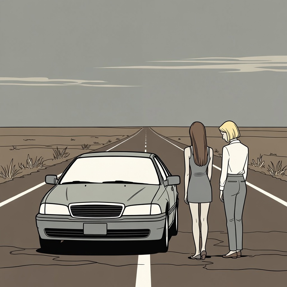 An illustration shows two women with long hair standing beside a gray sedan on a straight road in a barren desert landscape. One woman wears a short dress and the other wears a white shirt with pants. They face away from the car toward the endless horizon under a cloudy sky.