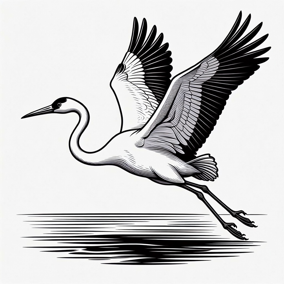bird illustration, bird in flight, black and white, clipart, crane flying, elegant bird, feathers, flying bird, flying crane, heron, illustration, isolated background, line art, long beak, long legs, vector art, water bird, water reflection, wildlife art, wings spread, crane bird