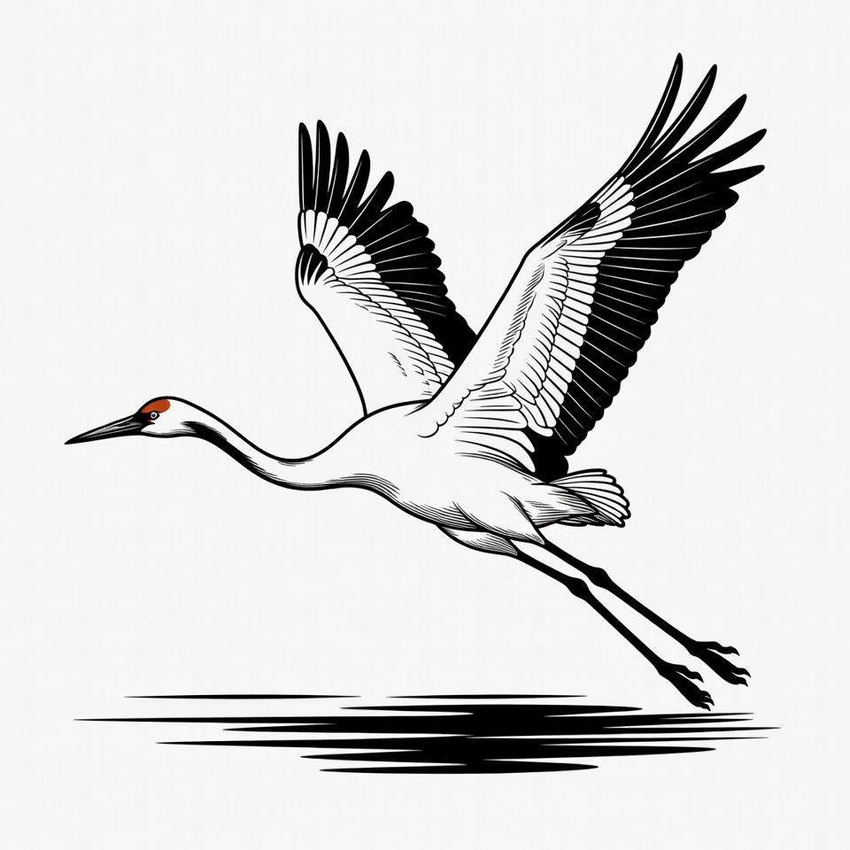 bird graphic, bird illustration, bird shadow, black wings, clipart, crane bird, crane flying, flying bird, isolated background, line art, long legs, red crown, spread wings, vector art, water bird, water reflection, white feathers, wildlife art, sandhill crane