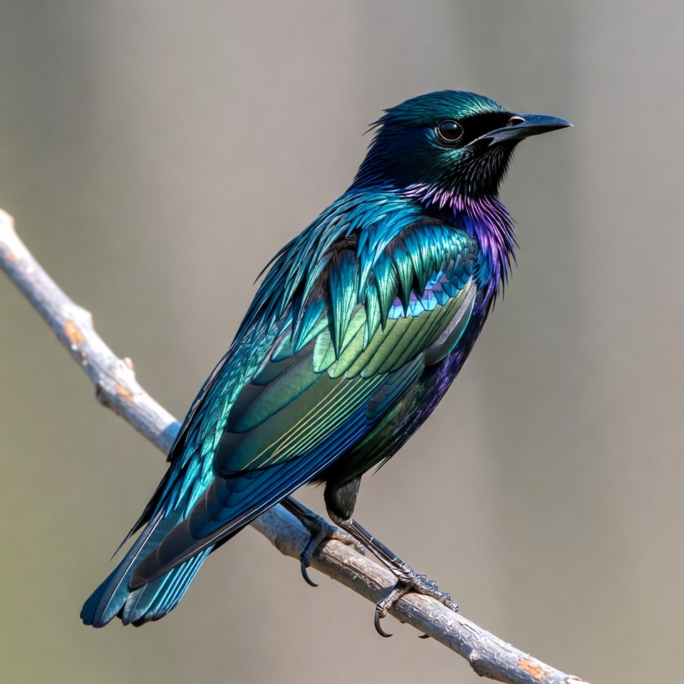 A vibrant starling bird with shimmering blue, green, and purple feathers perches on a thin branch. Its glossy plumage reflects light, highlighting iridescent hues across its body and wings. The bird faces slightly to the side against a blurred neutral background.