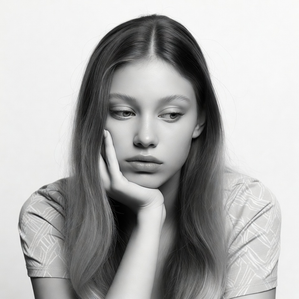 A young woman with long wavy hair gazes thoughtfully at the camera in a black and white portrait. She rests her chin on her hand with her elbow supported, wearing a patterned short-sleeved top. Her expression is pensive with slightly downturned lips against a plain white background.