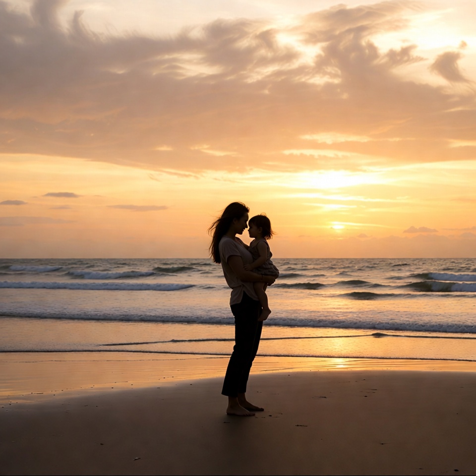 A silhouette of a mother holding her young child on a sandy beach during sunset. They stand facing the ocean with gentle waves lapping the shore, framed by a vibrant orange sky and setting sun. The mother wears a shirt and pants, barefoot on the wet sand.