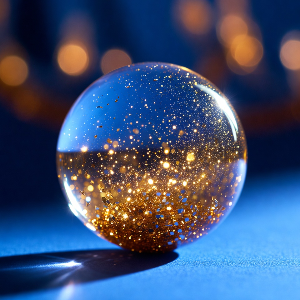 A large transparent crystal ball filled with golden glitter sits on a blue surface. It reflects and refracts surrounding orange bokeh lights, creating sparkling effects inside and out. The ball casts a subtle shadow on the dark blue background.