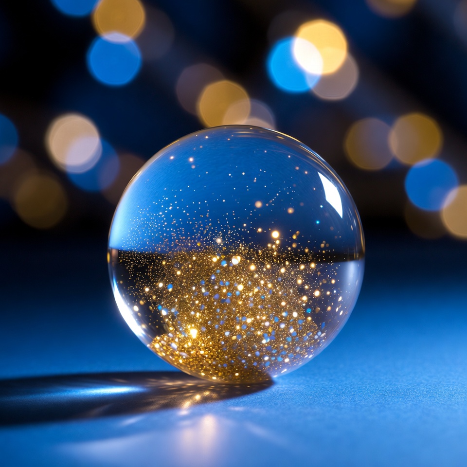 A transparent glass sphere filled with sparkling golden glitter sits on a blue surface. Surrounding bokeh lights in blue and orange create a festive background. The orb reflects light, highlighting the shimmering particles inside.