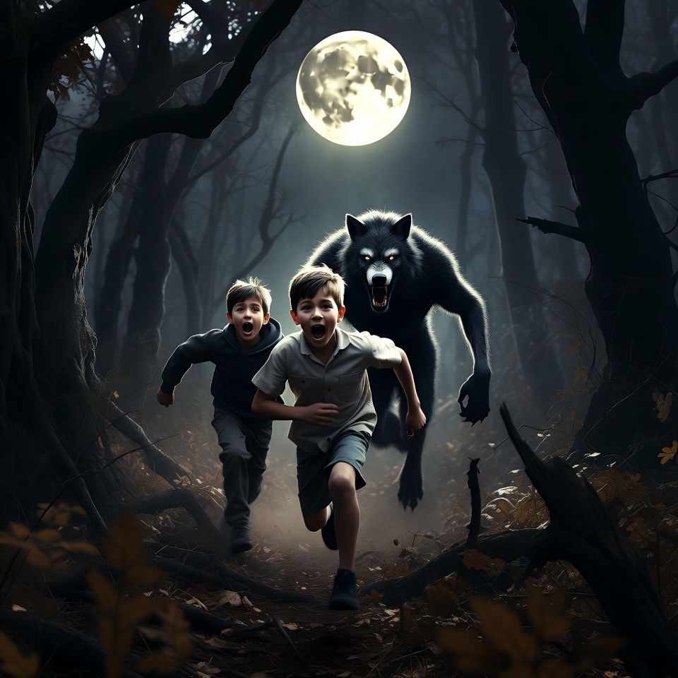 Boys Running from Werewolf in Moonlit Forest