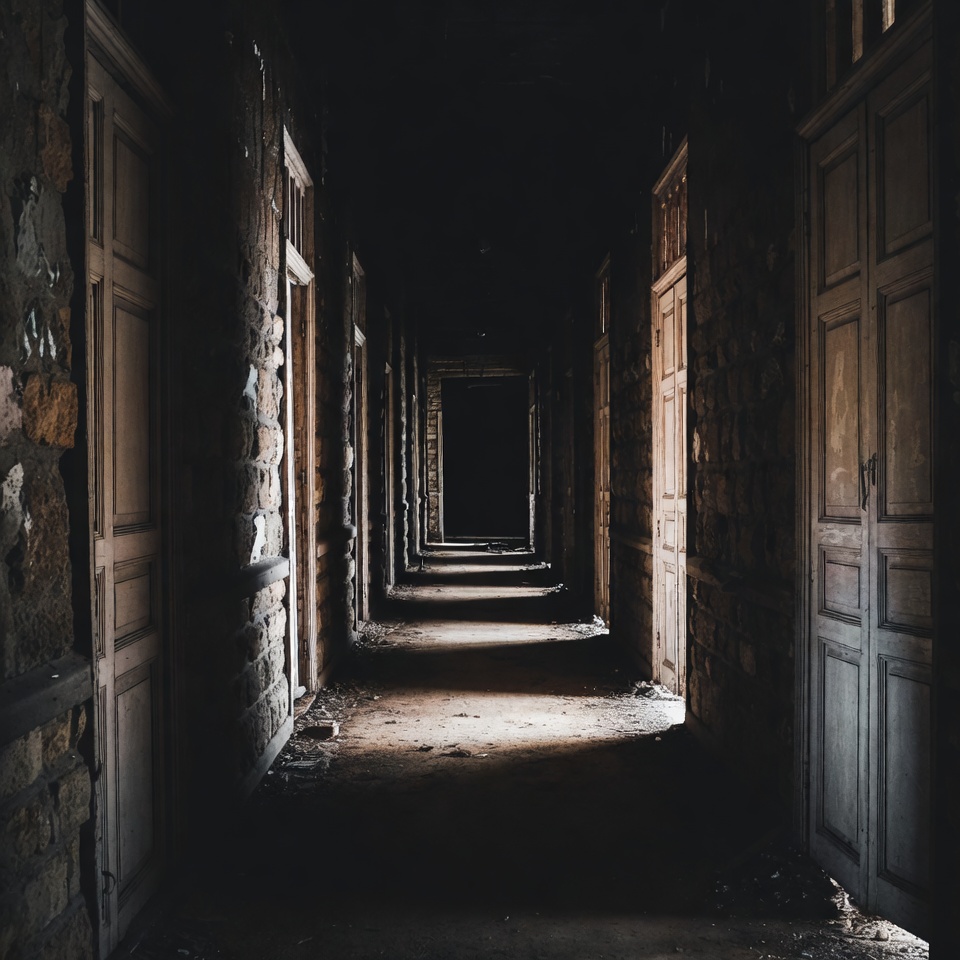 abandoned building, architecture, closed doors, dark interior, decay, dim light, eerie corridor, empty hallway, hallway, long hallway, mysterious hallway, narrow passage, old building, ruined interior, shadows, stone corridor, stone walls, vintage architecture, wooden doors, corridor