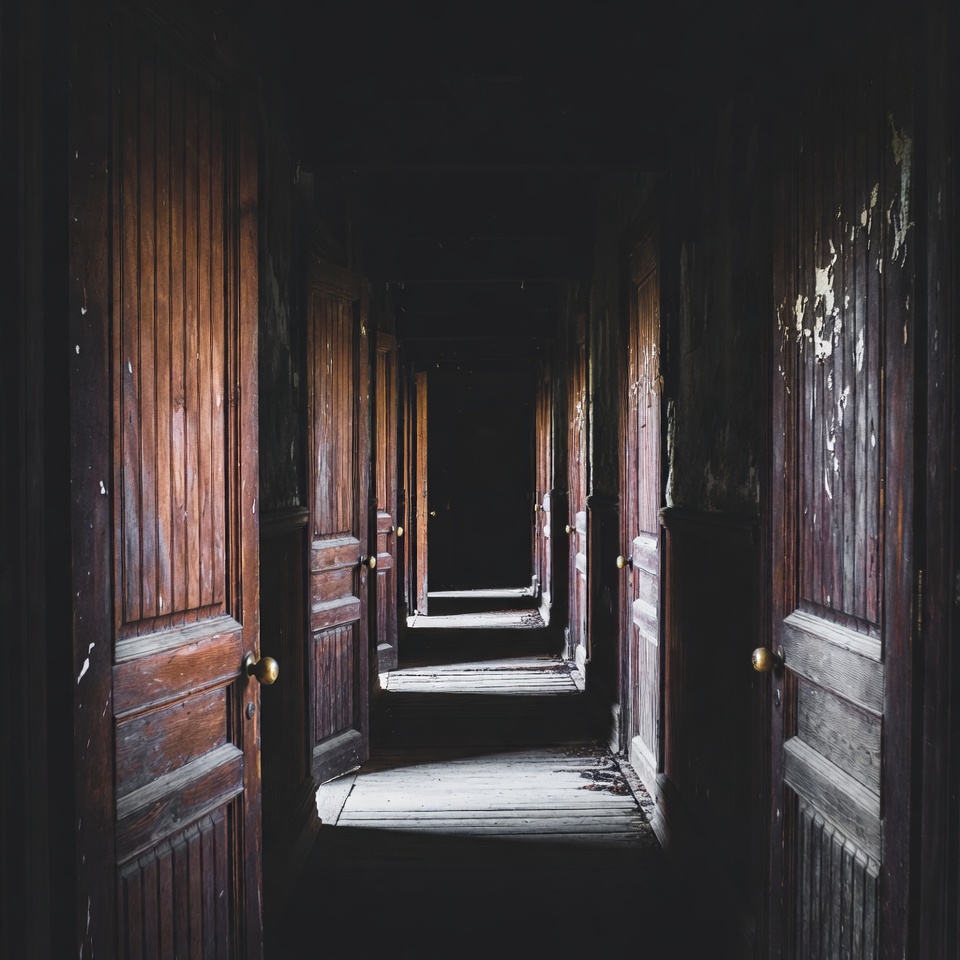 abandoned building, brass knobs, corridor, dark hallway, dim lighting, endless doors, interior architecture, mystery corridor, narrow passage, old doors, peeling paint, perspective view, spooky hallway, wooden doors, hallway