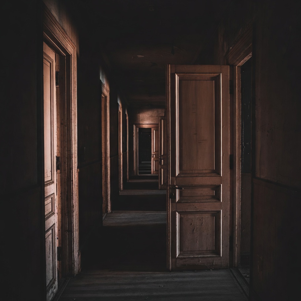 abandoned hallway, architecture, corridor, dark hallway, dim light, doors, eerie hallway, interior, long corridor, old building, open doors, perspective, shadows, vintage doors, wooden doors, hallway