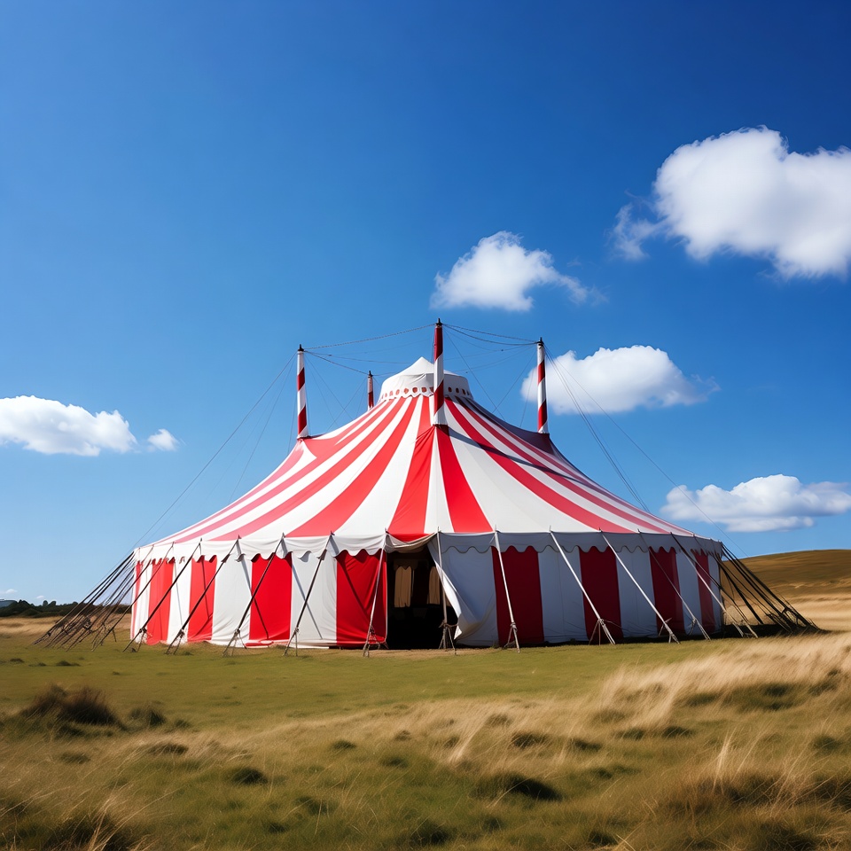 A large circus tent with red and white stripes stands on a grassy field under a clear blue sky. The tent features a pointed roof with red poles and an open entrance flap. Fluffy white clouds dot the bright sky behind the structure.
