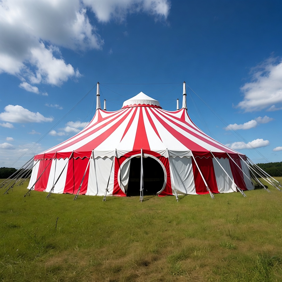 big top, blue sky, carnival, circus, clouds, entertainment, event venue, grass field, guy wires, isolated background, outdoor, red stripes, striped tent, support poles, tent entrance, white stripes, circus tent